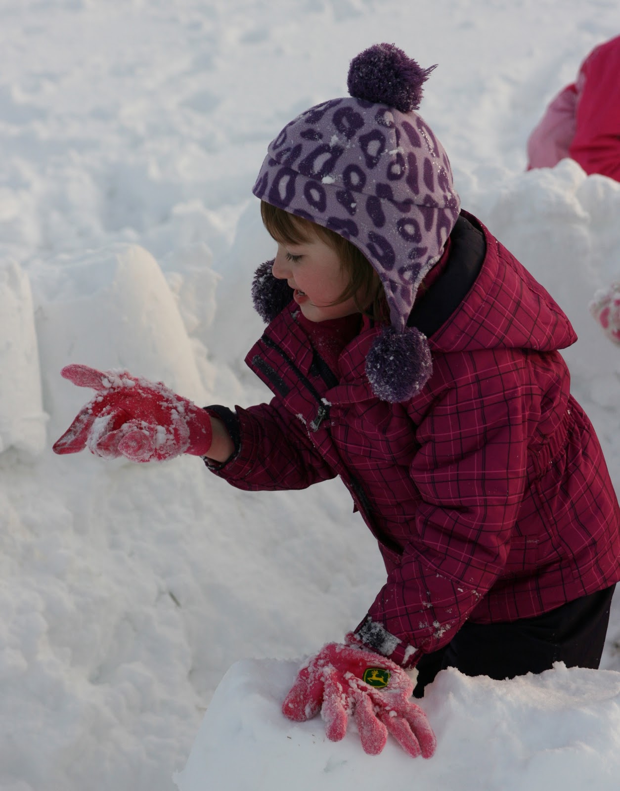 | Hallie's first pair of gloves became too wet during the snow activities. She put on an over sized pair of pink John Deere gloves. |